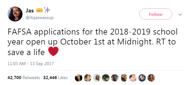 And don’t forget, FAFSA application is free. If a site tries to charge you, it’s a scam.