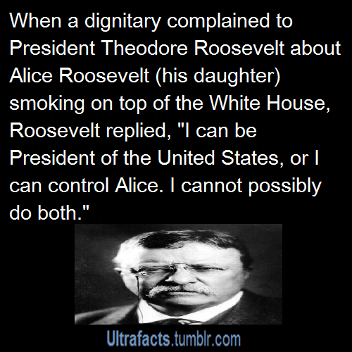 ALICE ROOSEVELT WAS HARDCORE. “She was known as a rule-breaker in an era when women were under great pressure to conform. The American public noticed many of her exploits. She smoked cigarettes in public, swore at officials, rode in cars with men, stayed out late partying, kept a pet snake named Emily Spinach (Emily as in her spinster aunt and Spinach for its green color) in the White House, and was seen placing bets with a bookie.