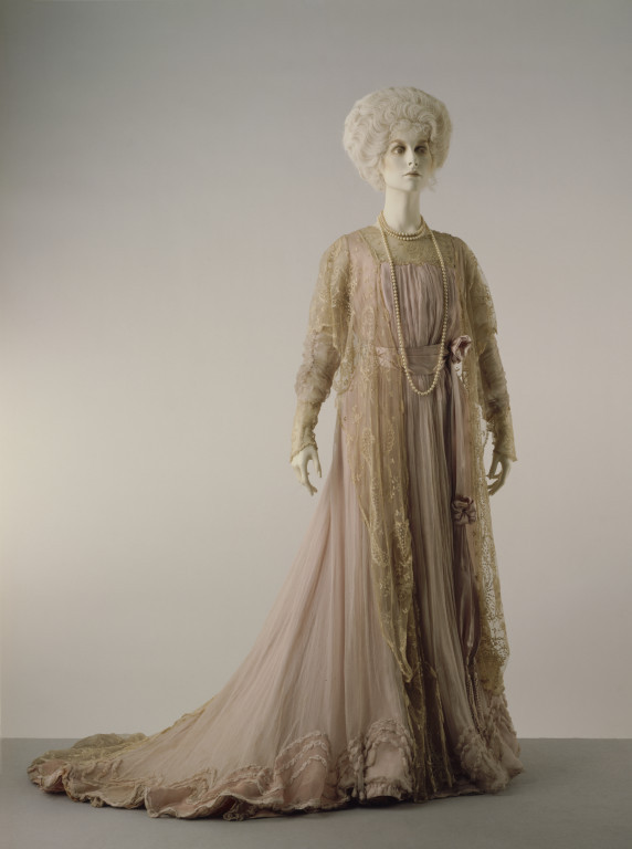 Medium: Satin, chiffon crêpe with ecru tamboured net, lace, lined, boned.