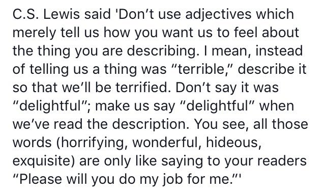 This is also why, when critiquing your work, writers might tell you to remove adjectives and adverbs, or why you might hear that those two types of words are “bad writing.” It’s not that you’re never allowed to use an adjective or an adverb, but that–like Lewis says–it’s much more preferable to be terrified, than to be told something is terrifying.