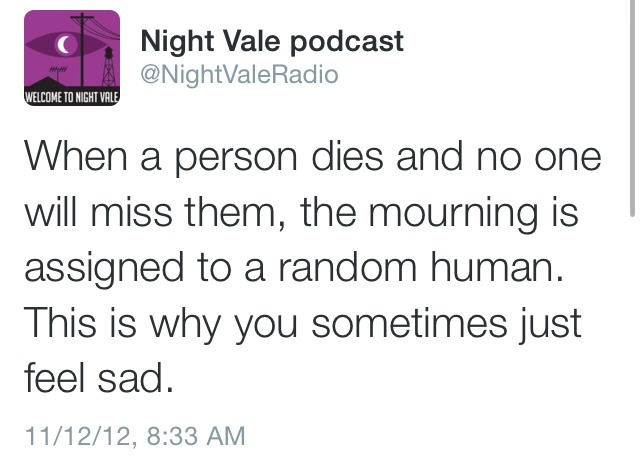 From now on if anyone asks me why I am randomly sad…instead of saying “I don’t know” or something I’m going to look them dead straight in the eyes and say “I’ve been assigned to mourn the death of a stranger” and just walk away