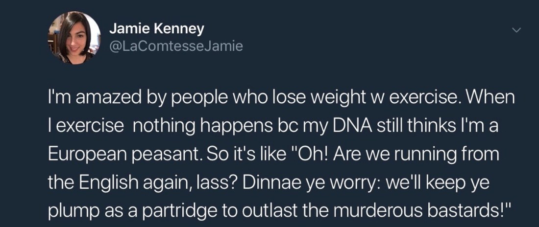 If you had a recent ancestor who went through starvation it actually altered their genetics and may have passed down genes to you that make you hold on to fat. So this tweet is more accurate than you’d think.