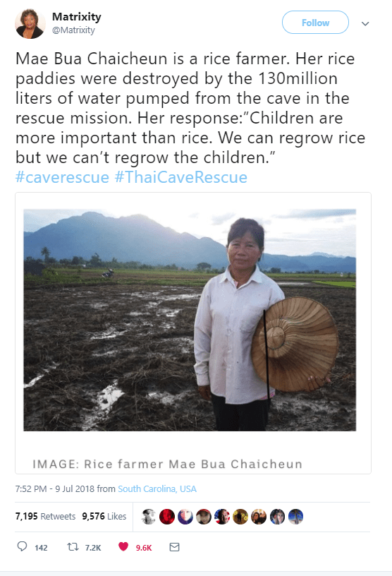 She has 5 acres of land where she farms rice all on her own since her husband died and she left it shortly after planting to go and give what she could to the rescue effort. She returned home a week later to find her fields flooded by the water being pumped out of the cave system.