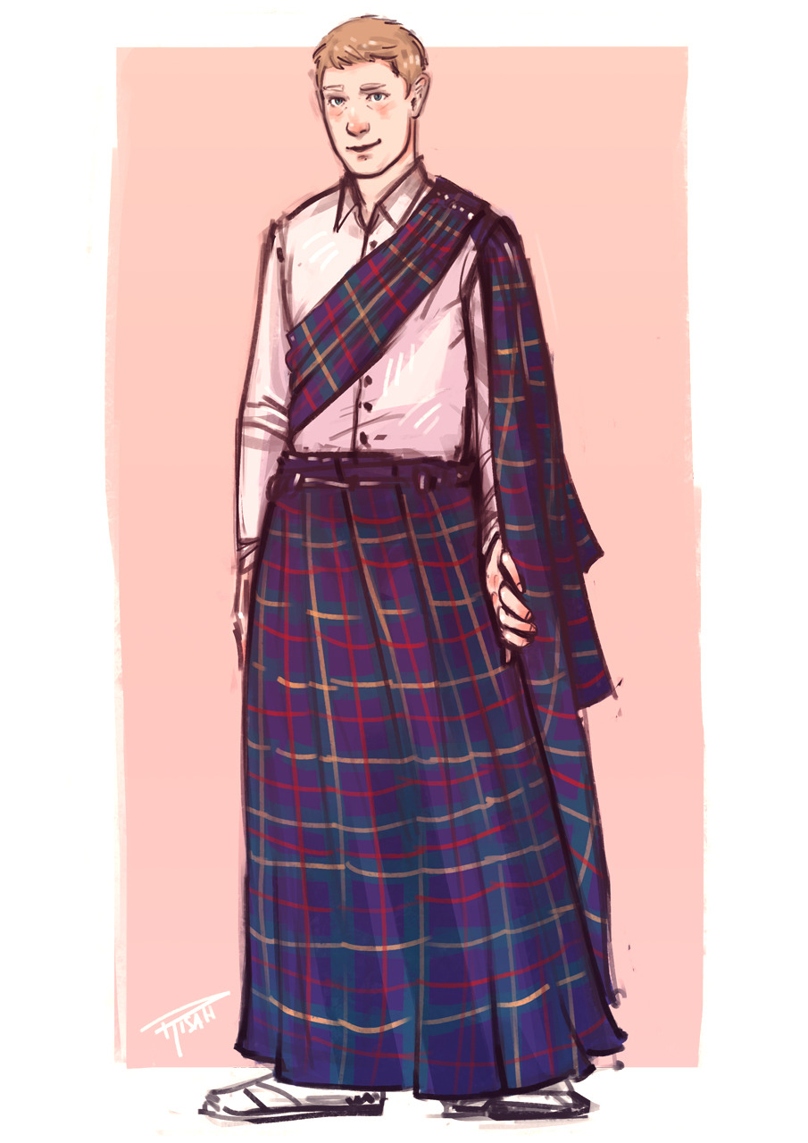 John’s smirk said he knew the exact effect the tartan layered and wrapped around his body had on Sherlock. He shifted the wide swath of fabric that went over his right shoulder, nearly brushing the floor behind him. The long tartan kilt hovered at his ankles, revealing delicate sandals.”