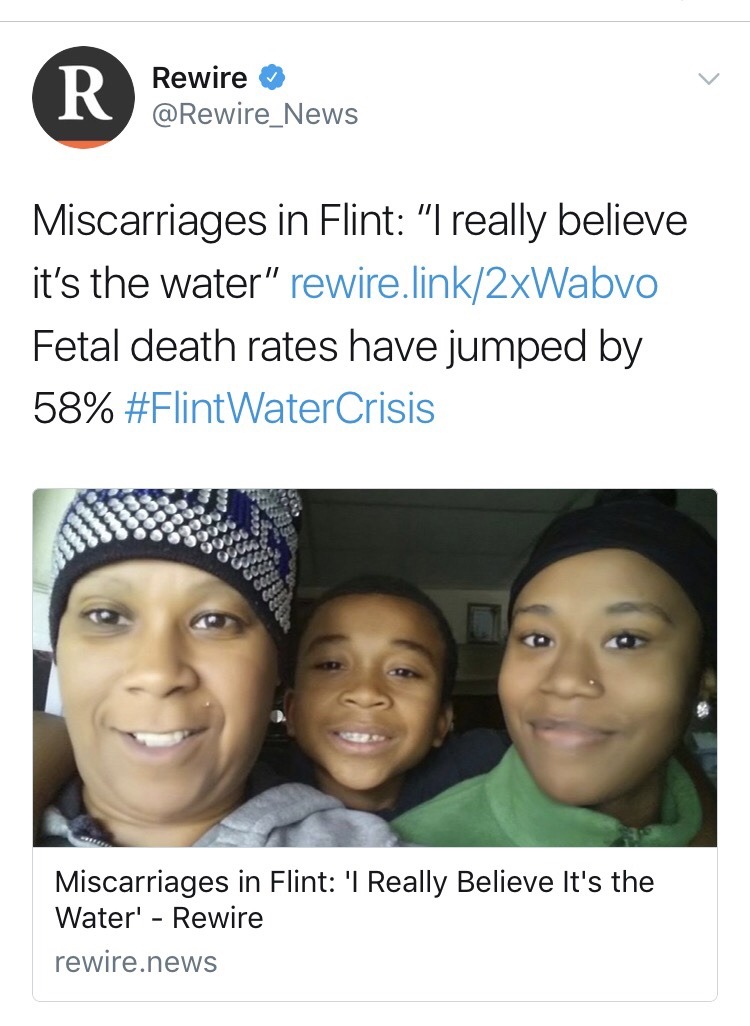 keep in mind this is a MAN-MADE health crisis. they changed the water of a lower-income black community for a reason. 12 people have died so far because of the water and now the women are suffering from miscarriages. this story needs as much attention as possible. a black community is still being poisoned and pro-lifers don’t seem to give a shit