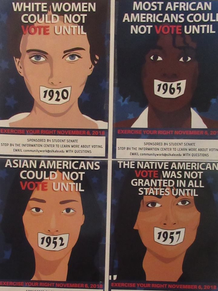 [ID: A picture of four similar posters. The first depicts the face of a white woman staring out at the viewer with top text in all caps reading “White women could not vote until.” A label silencing her mouth reads “1920″. The bottom text in all caps reads “Exercise your right November 6, 2018″. The following three posters follow the same pattern, depicting an African American, Asian American, and Native American woman with the years 1965, 1952, and 1957. End ID.]