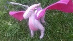 Thislittle cutie was my practice piece to get used to needle felting. She’s ultra light weight, being made of wool with polyester wings over an aluminium frame. The frame makes her adjustable so she can sit, stand, curl up, or rest comfortably on your shoulder with her long tail around your neck for balance. And, she could be yours!