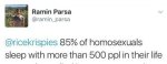 ‘85% of homosexuals sleep with more than 500 ppl in their lifetime’ factoid is a statistical error. Gay Georg, who sleeps with 500 people per night is an outlier and should not habe been counted.