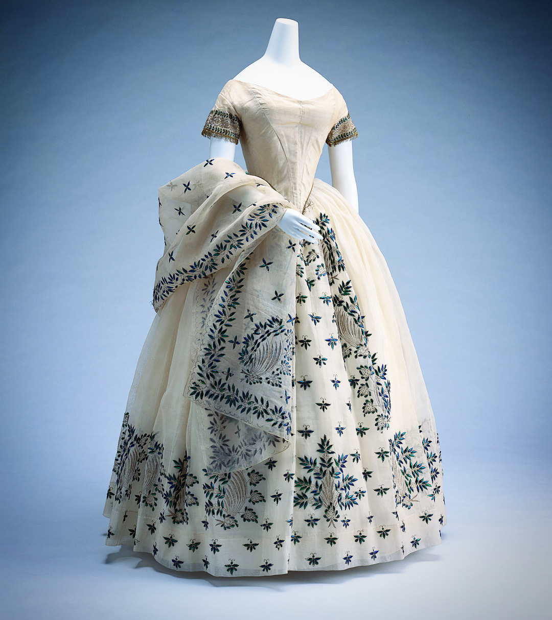 Evening Dress | c.1850 —This elegant dress is made of mull with applications of jewel beetle elytra. 1942 of these glistering forewings, with its color oscillating from green to purple, can be found on the dress, 1548 on the shawl.