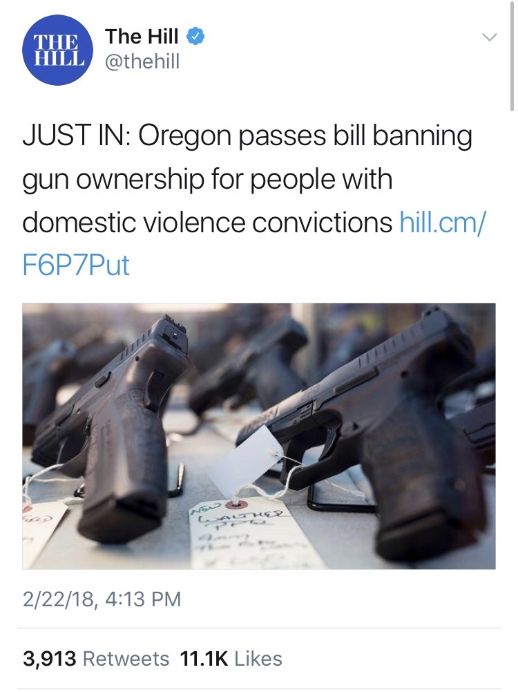 I also love how this bill doesn’t follow the ableist agenda that’s been going around lately that demonizes mentally ill people. The bill carefully specifies that the ban is for convicted domestic abusers. Good job Oregon.