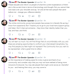 The online community young trans people have access to is literally life saving, I know from experience. But I implore you to go to your local trans support group, and listen. Don’t interrupt someone – they know their identity better than you. See, and hear, and think.