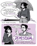I have come to realize I identify as a demisexual. After trying to figure out a way to explain to my friends and family, I wanted a visual to help me explain it and what it means to me. I searched the internet and I couldn’t really find a comic that could help visualize my personal feelings on the topic so I decided to put this together.