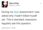 Or alternatively they have to ask about suicidal tendencies if there is any history of mental health or any detected mental health issue. It’s their duty of care, and yes if they asked something in that wording it would be horrible. People who claim PIP can also get it for mental health issues, so it is not in any way assuming that because someone is disabled they have to be mentally ill. These are medical professionals who have a duty of care.